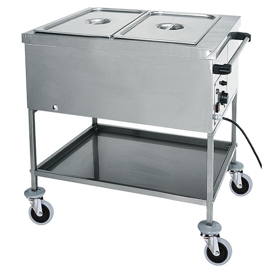 2x2cm kvadratisk stålrørkonstruksjon med AISI 304 rustfrie stålplater, børstet finish. Bain-Marie-brønn for inntil 20 cm dype GN-panner (ikke inkludert). PÅ/AV bryter med varsellys. Justerbar termostat, driftstemperatur fra +65 °C til +90 °C. Åpen sokkel med avtakbar hylle Svingbare hjul, Ø 12,5 cm.