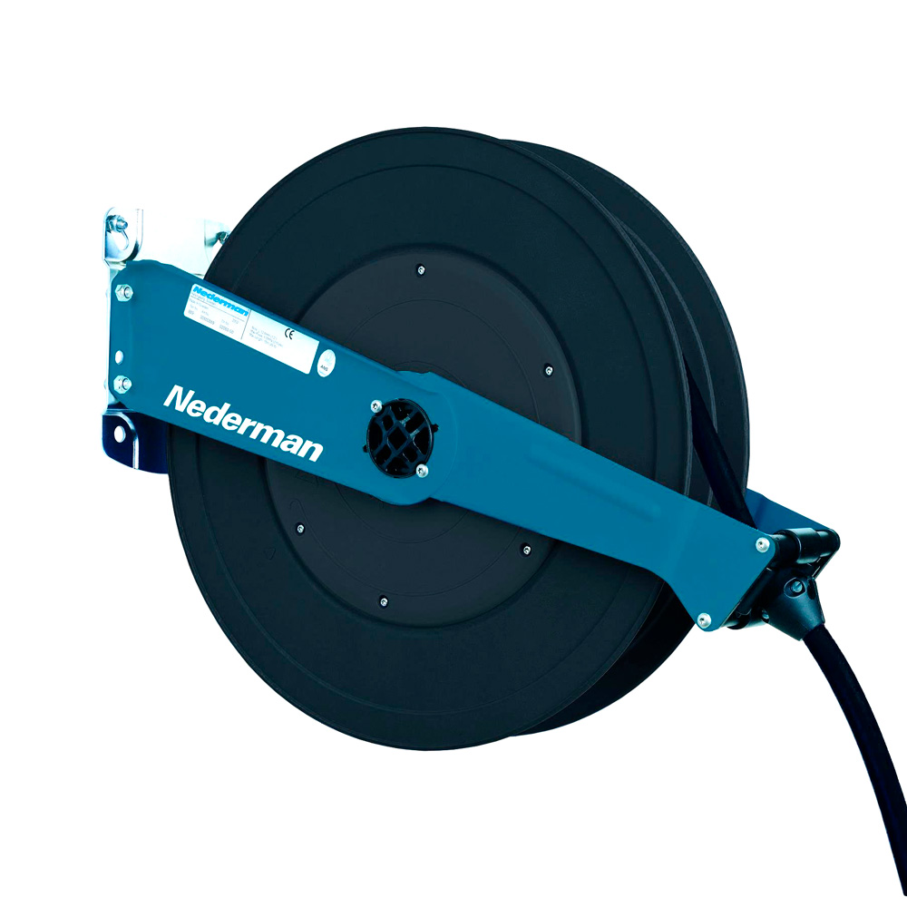 Kan monteres i tak, på gulvet eller på vegg. Trommelen har automatisk låse- og støysvakt opprull funksjon.