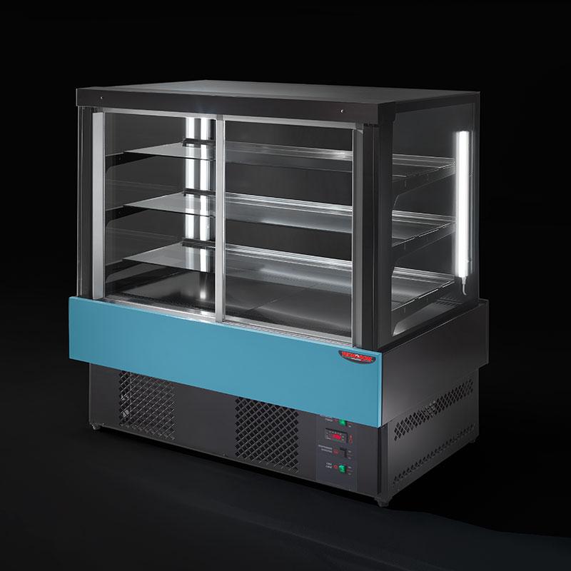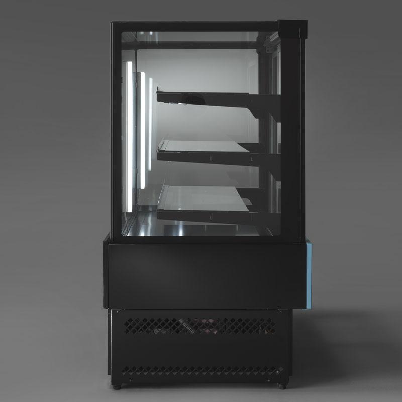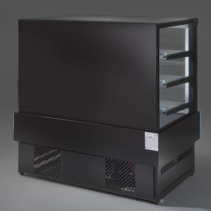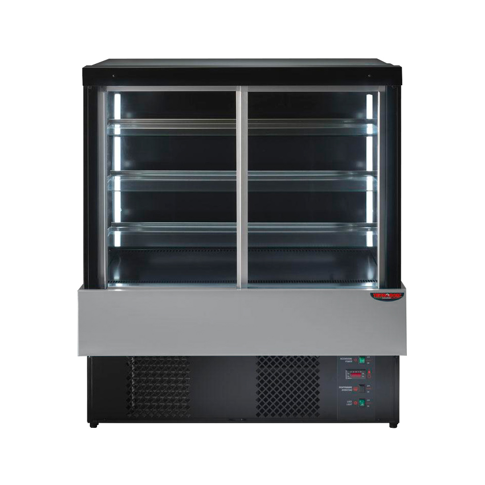 Tecnodom Varmedisplay / varmekabinett / eksponeringsdisk i svart pen utførelse med rett front og skyvedører.