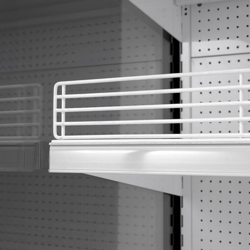 Hyller i giftfri hvitlakkert metall eller i rustfritt stål (for versjon i rustfritt stål), justerbar i høyden, utstyrt med prisholder og luftavviser og luftavviser.